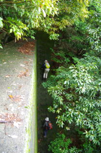 このポイントから一旦戻るような格好で反時計回りに急坂を登る。尾根筋まではしばらくであるが、急な尾根筋が続く。ガスは晴れず、緑の中に真紅のヤマツツジが咲く中を高度を上げる。