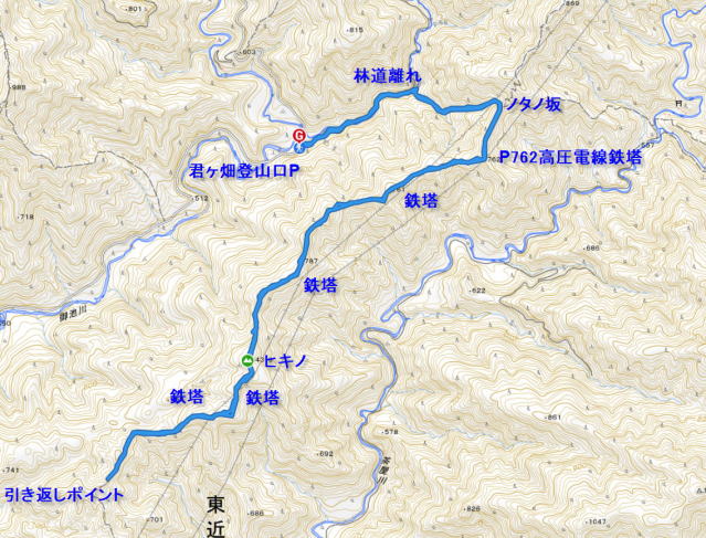 | 96)ヒキノ: 2022年10月25日 、2022山の記録に戻る 2022年花・鳥・その他に戻る 2022年蝶のページ 御池岳から土倉岳に派生する尾根筋はノタノ坂に達する。ここからさらに派生する尾根筋はヒキノ〜旭山〜岳と続く。高圧電線が尾根筋に続く。巡視路になっておりしっかりとした道が続く。この時期には紅葉と、眺望に恵まれる。送電線鉄塔では特に目を見張る展望が楽しめる。ノタノ坂からのアプローチと政所からのアプローチを結ぶため、ヒキノからさらに1q先まで進んだ。 自宅−君ヶ畑登山口駐車場(8:55、9:11出発)−林道分岐(9:28)−ノタノ坂(9:53)−高圧電線鉄塔P762 (10:05〜10:10)−高圧電線鉄塔(10:27)−ヒキノ(11:28〜11:33)−高圧電線鉄塔(11:37)−引き返しポイント(12:03)−ヒキノ(12:34〜13:01、昼食)−ノタノ坂(14:18)−林道出合(14:38)−駐車場(14:54)−自宅 行動時間:5時間43分 歩行距離:10.3q 累積登高:918m 君ヶ畑登山口駐車場、新しいバイオトイレが設置され見違えるようになった。川沿いに進み、川を横切ることになる。水かさがありf、左手の置き石を頼りに川を渡る。ヨメナ、アケボノソウが咲く中を進み、表示に従って林道からか離れる。鉄橋を渡る。勾配は次第に急になる。巡視路と思われる道が枝分かれする。25分の歩きでノタノ坂に到着する。茨川は直進で、尾根筋に右折する。高圧電線巡視路で踏み跡はしっかりしている。紅葉が始まり、日差しを通してきれいだ。気持ちの良い歩きが続く。 花