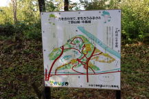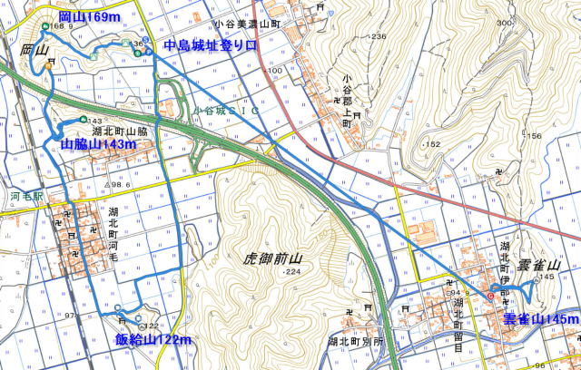 | 80)岡山169m・山脇山143m・飯給山122m・雲雀山144m:2025年9月3日、 2025年山の記録に戻る 、2025年チョウのページヘ戻る、2025年花・鳥・その他の戻る 中島城址登山口P(8:06)−中島城址(8:21)−岡山169m(8:36)−谷田神社(8:50)−取付き(9:01)−山脇山(9:10)−林道出合(9:16)−集落舗装道−南無薬師瑠璃光如来(9:33)−飯給山(9:38)−道路(9:44)−駐車場所(10:18)〜車移動〜公民館P(10:43)−取付き(10:51)−雲雀山(10:58)−駐車場(11:09)〜彦根の「あのベンチ」 行動時間:3時間2分、歩行距離8.2q、 累積登校:221m 湖北小谷山(小谷城)の周辺に低山ありとのことで出掛けた。 低山の4座が目標。スタート地から城跡巡りになる。「小谷城の戦い」陣地跡と関わりがあったとのこと。楽々の低山だったが、藪蚊に纏わりつかれて閉口した。忌避剤もあまり役に立たなかった。期待の長浜名物「鯖そうめん」は、長蛇の列で諦めた。 帰宅途中に彦根の「あのベンチ」へ寄ることができ、念願がかなった。 付近の案内図