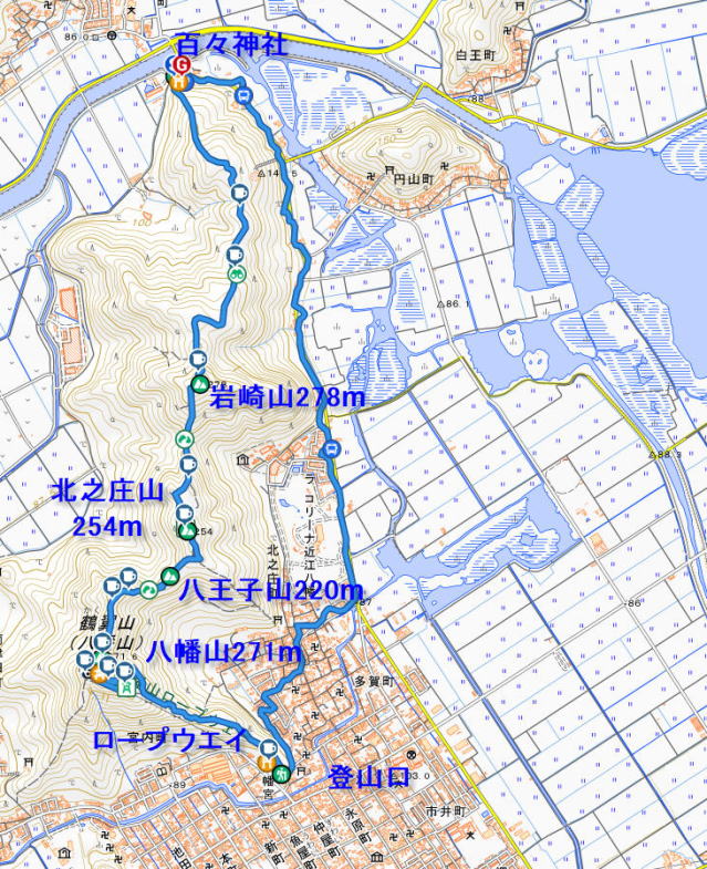 | 88):2025年7月1日、 2025年山の記録に戻る 、2025年チョウのページヘ戻る、2025年花・鳥・その他の戻る 百々神社駐車場(9:52)−展望所(10:33)−岩崎山278m(11:07)−打越の峠(11:19)−北の小(11:23〜11:52、昼食)−j北之庄山254m(11:59)−越(13:27)−八王子山220m(12:08)−八幡山(鶴翼山)271m(12:36)−八幡山最高峰(寺)278m(12:56〜13:13)−登山口(13:46)−日牟禮神社(13:48)−ラコリーナ前(14:15)-ボオーリス病院前-駐車場(14:41) 行動時間:4時間48分、歩行距離8.5q、 累積登校:444m 山の会、有志で八幡山の縦走を楽しんだ。展望台で爆音が響き、国スポの閉会式に飛ぶブルーインパルスの雄姿をカメラに収めた。久しぶりの縦走で、眺望を満喫した。アップダウンはあるもののそれほど長くなく、展望もあって、苦にならなかった。 琵琶湖国スポ、ブルーインパルス