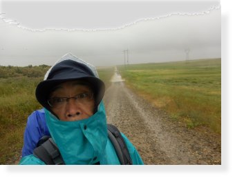銀の道での名物に水溜まりをジャブジャブ越えると言うのがあるんですが、どのブログを読んでも水たまりを越えるエピソードが掲載されていました。私に取っては出発前からそれが一番の驚異でした。昨日からの雨が災いし、早速それが現れました。銀の道の水溜まりは他と違って、避けようのないのが特徴です。脇を行こうとすると深みにハマるのです。それが最初に出現した場所は延々と麦畑がうねりながら続く道で、地平線が前にも後ろにも見えてます。そのどっちにもひとっこ一人いないと言うシュールな状況。昨日から降り続いている雨水が麦畑の谷部分に集中して川を形成してるのです。