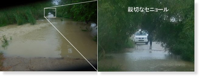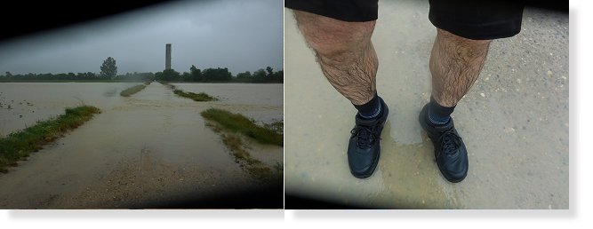 上の写真、分かりますかね?雨のためにレンズの開閉が中途半端になってますが、真中が道で両脇は洪水状態です。左の方が少し高くて堰を切った水が右側に流れ出しています。冷静に考えたら、こんなとこ近づいちゃいけない所だと思うけど、ここを行くしかないと思い込んでいるのでずんずん進んでいきます。