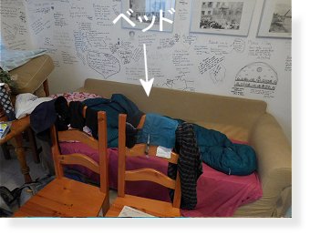 上段ベッドをあてがわれたので、下段が好きだと言うもありませんとの返事。その後やって来た巡礼のためにソファーにシーツを引き出したので、こっちの方が好きだと言ったらあっさりベッドチェンジ成功。それがこの一枚です。隣のソファーにはオランダのベンが陣取りました。ベンにはこのあと何度もお世話になることになります。