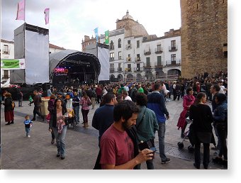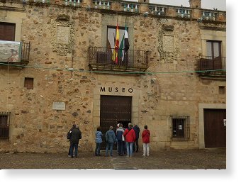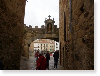 | 銀の道16 Caceres はじめての 休息日 カセレス 5月12日 ジャジャーン、本日巡礼初の休息日。今までサンチャゴ巡礼の道を何度も歩いたけど休息日って一度も取ったことなかった。勿論、膝の痛いのが治らないのもあるが、ここカセレスは中世の町並みで有名な所なので休息日にするには持ってこいと言う理由もある。おまけに今日の天気予報は雨100%だし。 同部屋の3人も7時と遅い起きだし。今のところ雨は降っていないが今日は一日中雨の予報だ。つるぴか君に「オイ ノ ジュビア」と言ったら、オイは今日全体のことで「今」ならアオラと言うんだと身振り交えて教わる。「今は雨は降っていない」と言うことだ。珍しくスペイン語を仕入れた。 カセレスで連泊することにしたので、まず宿を確保しなくてはだ。小雨の中、合羽を着て私営のアルベルゲ・Turisticoへ8時半に行ってみる。昨日ネットでこのアルベルゲの情報を見たときにはガラガラだったのに、何故か予約でフルだと言われる。ホントか!?余りに朝早くに来過ぎたのでタイミングが悪かったのだろうか。オーナーは予約台帳みたいのを見せて本当だよとアピールしているようだ。仕方ないので、次の町カサールdeカセーレス迄行くかと改めて雨仕度を始めたら、ベッドがあると言い出した。何で?キャンセルが出たと言っているらしいが、そんなの台帳を見てたんだから初めから分かると思うんだが。もしかして私を怪しんだのかな?何はともあれ泊まれるのが決まったので一安心だ。しかも15ユーロだったので、昨日の公営より1ユーロ安い。※お役立ち情報 Turisticoの私営アルベルゲは予約した方が安全のようです。 ネットではAlbergue-Residencia Las Veletasと言う名前で紹介されているかも知れませんが同じ宿です。(たぶん) Dirección: C. General Margallo, 36 Teléfono : +34 927 211 210 +34 638 337 069 部屋のほうはこれから掃除するので、少し待てとのことだったが、数分で終えたようだ。作業を終えて部屋から出てきた人が、あと5分待ってから入ってと伝えて行ってしまう。部屋に入るとほのかな匂いが漂っているので、使用した洗浄剤の匂いが篭っているから5分待てと言ってたらしいのが分かる。それで雨なのに大きな窓が開けっぴろげてあったのか。1階にあるキッチンの下見をしてから、食料を持ってキッチンへ。食器やレンジはあるけど流しがないので変わってるなぁ。そこへオーナーが洗った食器を一抱え持ってきたので丼を手に「アグア?(水は?)」と聞いたら備えてあるコーヒーメーカーからお湯を出せて、もっと熱くしたいのならレンジを使えと言われる。日本から持参のペペロンチーノの素をどんぶりにあけてスープを作り、パンを千切って入れる。粗末だけど美味い。ペペロンチーノの素は日本の百均で買ったもので、本来はスパゲッティに振りかけるものだが、スープにしても美味いことを発見した。ヨーグルトも食べてようやく腹も落ち着いた。 廊下で謎のカップルの女性と鉢合わせする。相変わらず怖い顔をしているのでドキッとしたが、なんと向こうから話し掛けてきた。お互いに片言英語なので通じやすい。2日一緒になったと、ちゃんと覚えてくれていたので意外だった。インパクト抜群の女性なので忘れようがないが、こちらにしたって東洋人は滅多に居ないので普通に覚えられるのか。相棒の少年がいないので聞いたら「ヤングマン」と形容したので、また二人の関係の謎が深まった。もし年下の恋人ならヤングマンとは言わずに「He」だろう???部屋に戻って今日の観光作戦を練る。10時に出発して、まず旧市街の中心を目指す。このアルベルゲは旧市街の中にあるので観光には便利だ。おまけに前の道路は巡礼路になっていて黄色い矢印が続いているから明日の歩き出しはばっちりだ。 宿を出て歩き始めたらポツポツと降ってきたので帽子を取りにまたアルベルゲに引き返すが、暫くしたら止んでくれたのでラッキー。今日は雨100%の予報だったが、ありがたいことに外れてくれた。こういう予報はどんどん外れてくれ。 カセレスは高い城壁が旧市街をぐるっと回っている城塞都市。その中はまるで中世の町でロメオと何とかの舞台のようだ。インフォメーションも中世の建物をそのまま利用した趣のある造りだった。そこで顔見知りの巡礼夫婦が私に気づいて声を掛けてくれる。やっぱり有名な町なのでほかの人たちもここカセレスでは一日を観光に当てているようだ。でも、私と違ってこの二人は2泊ともアルベルゲには泊まってないそうだ。 次にスペインにはどこにでもあるマヨール広場に行ってみる。ここが城の表門になっているらしく、凄く立派な門があり、みんなこの前で記念写真を撮っている。この城門から壁伝い左回りに見て回ることにする。あちこち観光客で賑わっているので気分が高揚して楽しい。中世の建物の中で何か展示しているようだが、チケット売り場がないので無料のようだ。入ってみるとお土産も少しばかり売っているが、中の展示