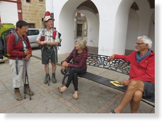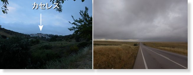 | 銀の道17 Caceres - Casar de Caseres 今日は最短コース 5月13日 カセレスのアルベルゲを7時5分に出発する。休息日が効を奏したのか出発から膝が痛くない!だが安心はできないので、最初の20分間はそろりそろりと歩いてみる。腰も立ち上がった時に少し痛む程度で注意してれば問題なさそうだ。町を出たところで少し迷うがあとはオッケー。前後には一人の巡礼もいない道が続くが膝が痛くないのでとても快調だ。 ![]() 町を出てしばらく歩いて振り返ったら、あんなに大きかったカセレスの町がやっぱりこぢんまりとひと纏まりとなって見えるから不思議だ。日本なら必ず道端にパラパラと店があるとか民家があるだろう。 前を向くと一直線の道路の先にはどんよりした雲が厚く垂れ下っているので雨が心配されるが、降られるのなんか膝が痛いのより百倍もいい。天気が悪いのでやってくる車はライトを点けている。 ![]() 今日はショートコースだしどこも痛くないし気分爽快。最初は舗装路だったが、脇道に誘導されると巡礼路らしいのどかな道に代わる。3時間半歩いてもう今日のアルベルゲがある町、カサールデカセレスに到着。ちょっと短かすぎるが、ここを過ぎると少し高い宿賃のオスタルがある町まででも21kmは歩く必要があるので、無理は禁物。折角膝が良くなったのにぶり返したんじゃ元も子もない。 町に入る手前で矢印を見失って迷っていたら、タイミング良く向こうから地元の人がやって来た。教えて貰おうとこちらが声を掛ける前にカミーノはあっちだと教えてくれる。その後も同じように、聞いてもいないのに3人の人が道を教えてくれた。田舎の人は巡礼に親切。 通りに面した所に私営の立派なアルベルゲがあったが、もちろん素通り。町の中心部にやってくるとアルベルゲはすぐ見つかった。窓が全て開いており、まだ掃除中のようだ。道路をひとつ挟んだ向かいのバルが受付らしい。これは情報どおり。 外のテーブルには3人の巡礼親父達が朝飯を食べていた。受付はここかと尋ねたら、中に連れていってくれマスターに何か言っている。やはり掃除に1時間掛かるので、入らずに待っててくれと言われる。テーブルで待っててくれても構わないそうだが、アルベルゲ前の広場には手ごろなベンチがあるので、そこに座って日記を書く。 親父達のテーブルに移動して変な英語でお喋り。この人たちは3人組かと思ったら、二人はチャリで一人は歩きだった。私みたいにここに到着してきたんじゃなくて、休憩中のようだ。 服装を見れば分かるが、自転車組は風を切るのでジャンバーを着ていて歩きは半袖スタイル。自転車は歩く何倍もの距離を走れるから、途中もゆっくりできるのだろう。しかも今日は40kmだけ走るそうだ。ものすごくのんびりした行程だよ自転車なのに。と言うことは、チャリ組はこのアルベルゲに昨晩泊まって、まだ出発してないってことなんかな? 歩きの親父は昨日は50kmも歩いたそうだ。ホントか!自転車の二人より歩いてるじゃん。と言うことは中世の町カセレス見物をしなかったのか。勿体ないと思うが巡礼スタイルは人それぞれだ。 受付簿を見たら3人の名前があったので、このアルベルゲに泊まってまだ出発前だったのが分かった。なんてのんびりしてるんだろう。年齢も記入されてるので三人とも私より年下だったのも分かる。欧米人は老けて見えるので見ただけじゃ年が分からん。 歩きの人は今日33kmを歩くそうだが、まだこんなところでのんびりしている。夕方までに着けばいいそうだ。私が33km歩く日は、朝からガツガツ歩き始めて午後の早い時間に到着するようにするのだが、こういうスタイルもあるんだなぁと感心する。さすが一日に50kmも歩く人は違う。 全員とハグしてから3人とも出発していったので、バルの中に入って受付してもらう。今回最低額の5ユーロありがたや。カフェコンレチェも1ユーロと最低価格だった。アルベルゲに連れてってくれ、ベッドを案内される。中ではまだ掃除のおばちゃんが活躍中だった。おばちゃん愛想がいいしマスターも感じがいいので、とても気に入ったアルベルゲになった。アルベルゲの建物には善し悪しがあるが、管理人の人柄もアルベルゲの大切な要素だ。スペイン人は悪気はなくてもニコリともしないのがいるが(昨日のアルベルゲ)、別に怒っている訳ではないらしい。でもやっぱり笑顔は万国共通のコミュニケーションと思うぞ、昨日のオヤジ。 アルベルゲの建物は道路反対側にある町役場とそっくりの色使いなので役場関係の公営なのだと分かる。白い建物に赤の窓枠がとてもスペインらしい。一人巡礼が通過して行ったが、ここの次は21.8km先のアルカンタラのオスタル泊まりか、次にアルベルゲがあるのは33km先のカナベラルだがどうするのか? 10時過ぎてからやっと朝食。8Pチーズ4つ挟んで軽くチンしてみる。チーズが程よく溶けてとても美味い。持ち歩いているインスタントコーヒーとジュースも飲む。コーヒーを飲むとゆ