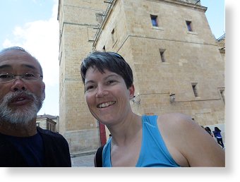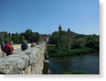 | 銀の道26 Morille - Salamanca 歴史の街サラマンカ 5月22日 Morilleを7時25にスタートする。個人が所有している牧場の扉を何回も開けたり閉めたりしながら丘を3つ越える。巡礼路を塞いで牛が朝食の時間だ。刺激しないように通らせてもらいます。大きな牛の群れの中を歩くのは緊張するが犬の群れより遙かにましだ。![]() 最後の小高い丘の上に到達したら十字架が立っていて、何人もの巡礼たちが休んでいた。そこから遠くにサラマンカの町が見えていたのだ。大きな町は遠くに見えてからが時間が掛かる。案の定、町が見えてから1時間半が必要だった。 町に入る手前から自然に数人のグループになったので心強い。大きな町は一人だと必ず迷うのだ。石つくりの長い橋の向こうには大きな建物が見えている。あれがカテドラルがある旧市内のようだ。ずんずんと進んで行くと道の両側は歴史を感じる重厚な建物に囲まれてきた。観光している人もいっぱいいる。全員がカテドラルまでやって来るが、そこからはバラけてそれぞれ目指す場所が違うらしい。ドイツの夫婦は私と同じ公営アルベルゲが希望なので一緒に探すことにする。タブレットを出してアルベルゲ探しを始めるとGPSが旨く機能して12時少し前にアルベルゲ前に到着する。 歴史的建築物に見えるが、入口の扉は大きなガラス扉なので近代的にリニューアルされているようだ。ここはチェックインが4時なんだよな。遅すぎでしょ。でも入り口前でウロチョロしていたら意外なことに扉が開いてチェックインだけはしてくれるらしい。ここはドナティーボ。ただし、実際に部屋に入れるのもシャワーを使うのもやっぱり4時からだそうだ。バックパックを預けられるが、ベッドルームには持ち込ませないで大きな黒いビニール袋に入れさせられた。ダニ対策らしい。昨年のゲルニカがこうだったのを思い出した。年寄りのオスピタレロは少し頭がおかしい爺ちゃんと感じたが変人だけなのかも知れない。どっちにしても余りまともには見えない。 時間まではどっかに行ってなくてはならないらしい。巡礼定食が5ユーロと激安で食べられるバルを教わったので、まずそこに行って昼飯を食べよう。ドイツの夫婦と貰った地図を片手に探す。行ってみると顔見知りの他の巡礼もやってきていた。みんな私と同じで安いとこがいいんだよな。外のテーブルでドイツの夫婦と食べることにする。巡礼定食には通常、水かワインが選べるのだが、さすがに5ユーロでは水だけだった。私は別料金でビールを頼んだが、夫婦は水にしていた。それでもビール込みで6.5ユーロと安いことには変わりなかった。水が貰えるのなら貰いたいと、あとから水を所望する。ここのミネラル・ウォーターが入ったボトルは小型だったので、これが欲しかったのだ。以後は水切れ緊急用にはこれを持ち歩くことにする。 隣のテーブルに一人で座っている地元の人らしい男が私の方をチロチロ見ているのが気になる。旅先ではどうしても危険回避のためにアンテナが高くなっている。そしたらついに話しかけてきた。この男は日本に行ったことがあって、それで私が日本人だと思って話しかける機会を伺っていただけらしい。この人が訪問した日本のことでひとしきり盛り上がる。と言っても相変わらず片言だけだが。怪しい人じゃなかった。 昨日の頑張りが堪えて朝から疲れてるので、明日はサマランカに連泊して休養することにする。今日のアルベルゲはチェックインが4時。これでは余計疲れが取れない。公営のアルベルゲは連泊は不可なので別の宿を探さなくてはならない。 私が宿の予約をするときはHotels.comというサイトを利用しているのだが、そこは10回利用すると1泊タダで泊まれるという得点がある。いままでその得点を使って1回泊まったことがあるが、すでに2回目を泊まれるだけのポイントが溜まっている。それをここサラマンカで使おうって作戦なのだ。ここのバルのWi-Fiキーを教えてもらってHotels.comにアクセスして安宿を検索する。1泊無料と言ってもホテル代には制限があって、それまで利用したホテル代の平均が無料の範囲だ。それでいくと私の場合は3.000円弱のホテルしか泊まることはできない。日本の感覚だと、そんな安いのがあるのと思われそうだが、でもそれがあるんだな。選んだのはホテル・アメファ。オスタルでなく本物のホテルだ。サラマンカの中心マヨール広場から近く、ネットの紹介写真で見てもまずまずのホテルだ。早速明日の予約を入れる。日本円なら2,679円の宿代が無料だが、税・サービス料の268円は持ち出しだ。これで明日はサラマンカで連泊決定だ。今日のアルベルゲは決まっているし気楽さが倍増する。 暇つぶしにカテドラルでも見物するかと入り口に行ったら、ここでスタンプが貰えるそうだ。サラマンカのカテドラルのスタンプなら欲しいな。クレデンシャルを取りにアルベルゲに戻るも、入り口は施錠されていて入ることはできない。仕方ないので4時ま