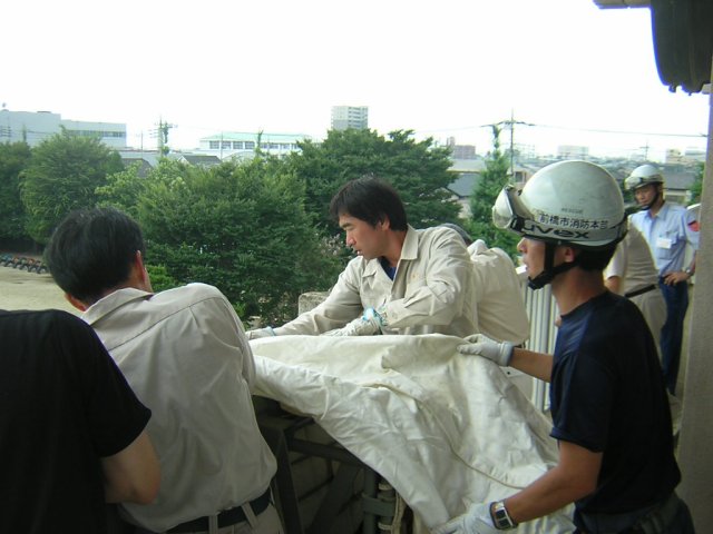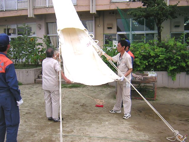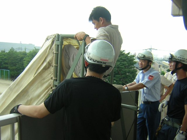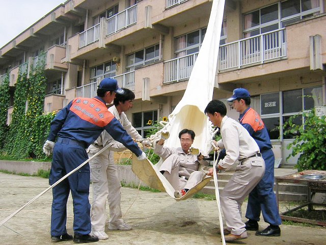 実際の火災では、じっくりと地面に固定できない場合があるので、そのときは地面には固定せず、画面に見える取っ手を数人で持てば、脱出は可能です。 |