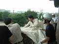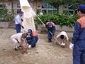上の者と下の者は互いに声を掛け合いながら安全にシューターを降下させます。 |
