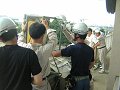 消防隊員の方の指導で、シューターをアンカーに固定していきます。引き綱のテンションは同じにし、確実に固定します。 |