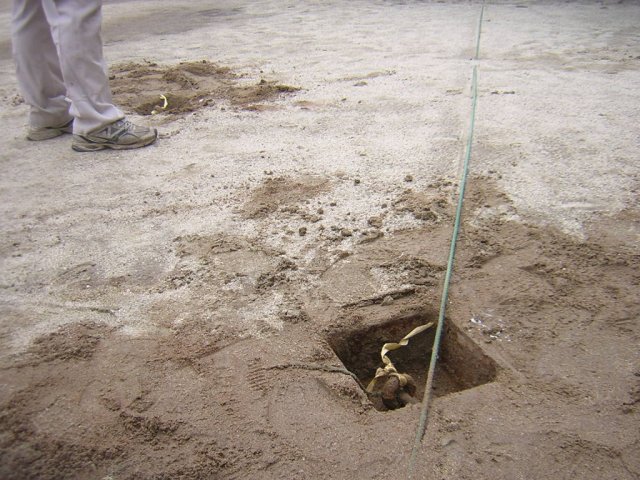 | これがシューターを地面に固定するためのアンカーです。滅多に使うことのないアンカーは、土に埋もれています。 |